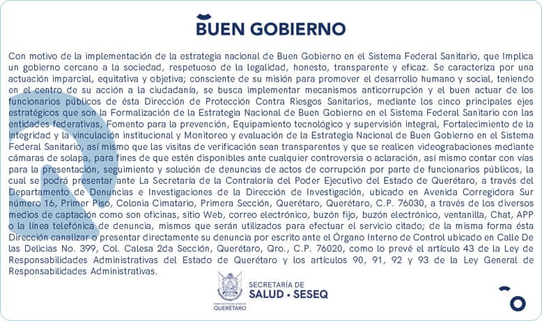 Ponemos a su disposición este video tutorial para que pueda presentar su queja o denuncia en caso de haber sido víctima de un acto de corrupción por parte de algún servidor público de esta Unidad. Esta acción forma parte de nuestro compromiso con la mejora continua de los servicios y con la implementación de la Estrategia Nacional de Buen Gobierno en el Sistema Federal Sanitario, reafirmando así el compromiso de esta Dirección con la población de Querétaro.